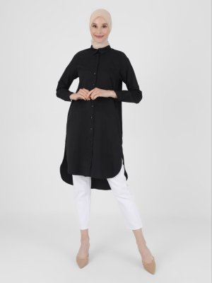 Refka Siyah Yırtmaç Detaylı Uzun Poplin Tunik