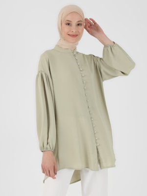 Refka Zeytin Yeşili İpek Tuşeli Balon Kollu Tunik