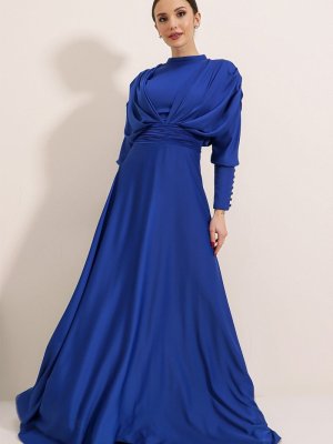 Saygı Giyim Saks Ön Arka Büzgülü Kollar Düğme Detaylı Astarlı Uzun Saten Abiye Elbise