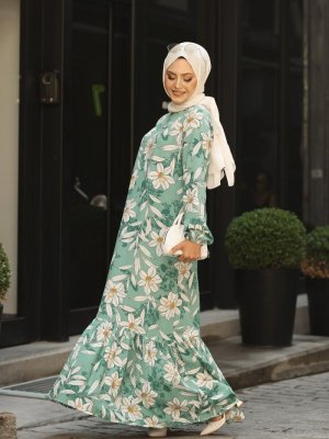 Tesettür Vagonu Su Yeşili Zambak Desenli Eteği Fırfırlı Elbise
