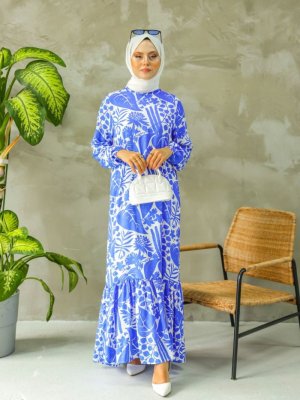 Tesettür Vagonu Mavi Yaprak Desenli Tam Boy Eteği Fırfırlı Hakim Yaka Elbise