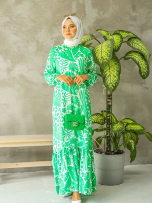 Tesettür Vagonu Yeşil Yaprak Desenli Tam Boy Eteği Fırfırlı Hakim Yaka Elbise