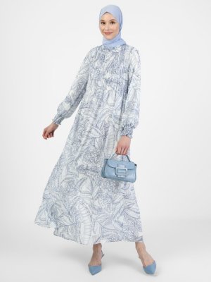 Refka Mavi Çiçek Desenli Gipe Detaylı Elbise