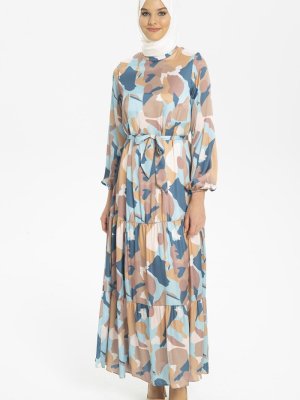 Beyza Mavi Desenli Fırfırlı Sulu Boya Elbise