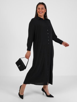 Alia Siyah Büyük Beden Sivri Yaka Düğmeli Elbise