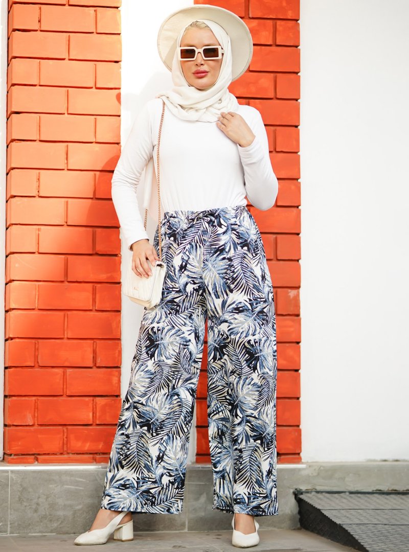Por La Cara İndigo Renkli Desenli Salaş Pantolon