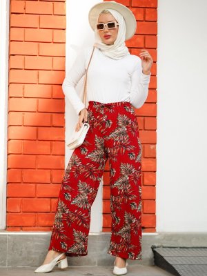 Por La Cara Bordo Yaprak Desenli Salaş Pantolon