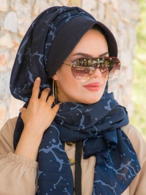 AİŞE TESETTÜR Lacivert Mavi Baskılı Şapkalı Şal Çok Renkli