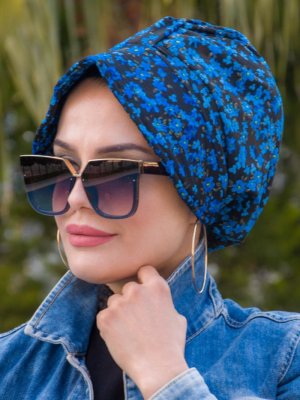 AİŞE TESETTÜR Çiçekli Fularsız Şapka Bone Siyah Mavi