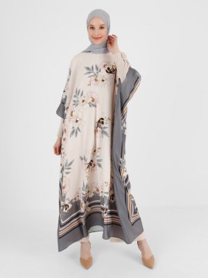 Refka Bej Pudra Çiçek Desenli Abaya Ferace