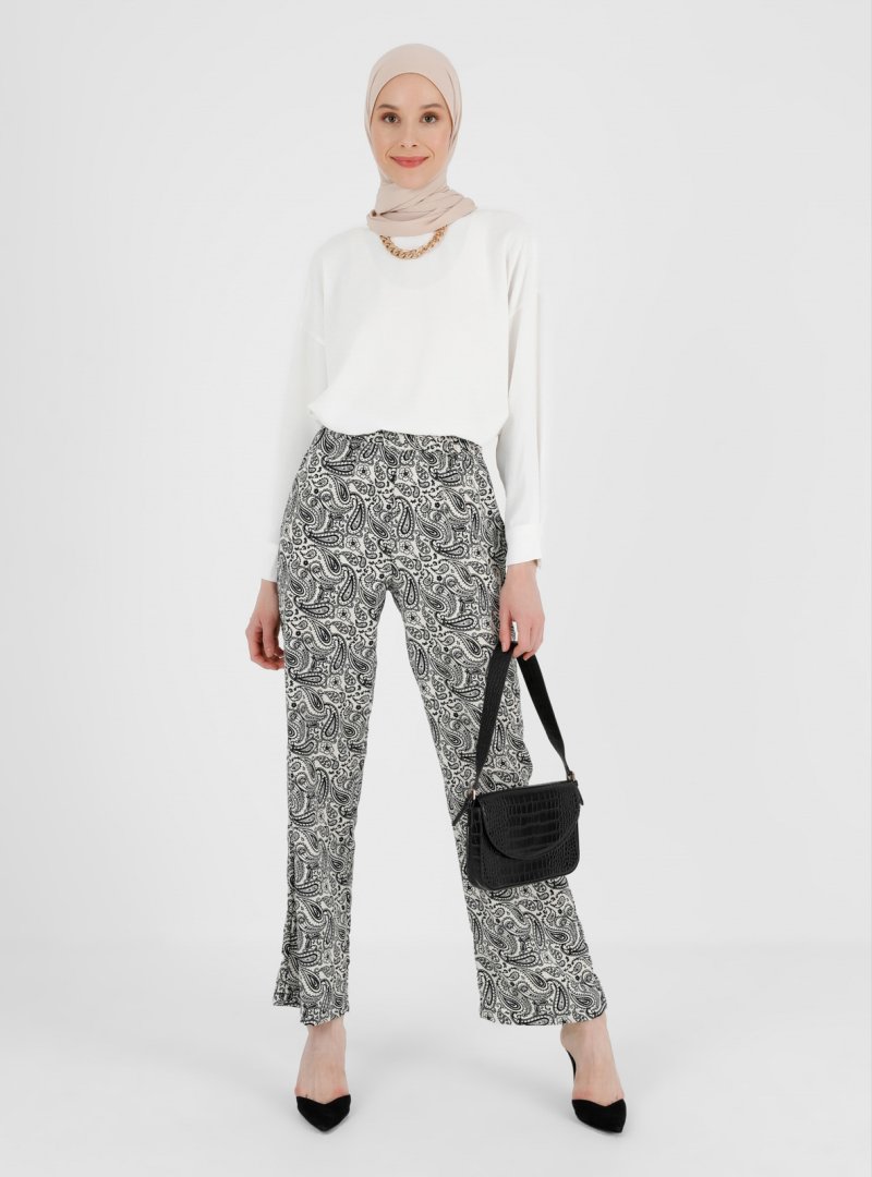 Refka Siyah Beyaz Şal Desenli Saten Pantolon