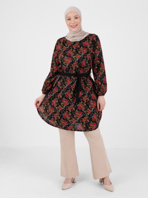 GELİNCE Büyük Beden Çiçek Desenli Tunik Siyah