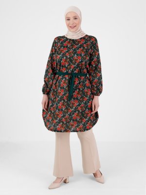 GELİNCE Büyük Beden Çiçek Desenli Tunik Yeşil