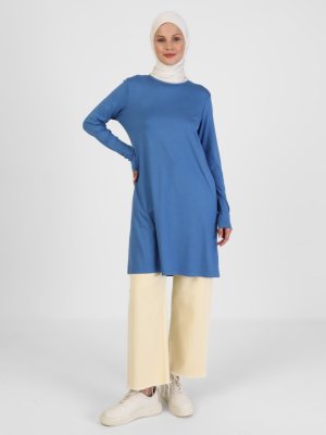 Refka Gece Mavi Viskon Kumaştan Bisiklet Yaka Tunik 85 Cm