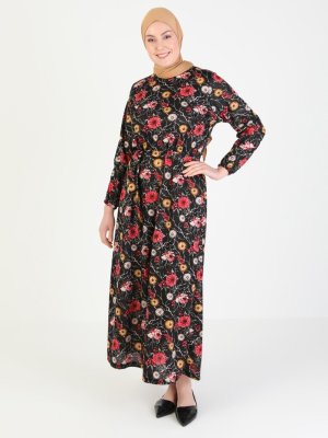 GELİNCE Desenli Elbise Siyah Bordo