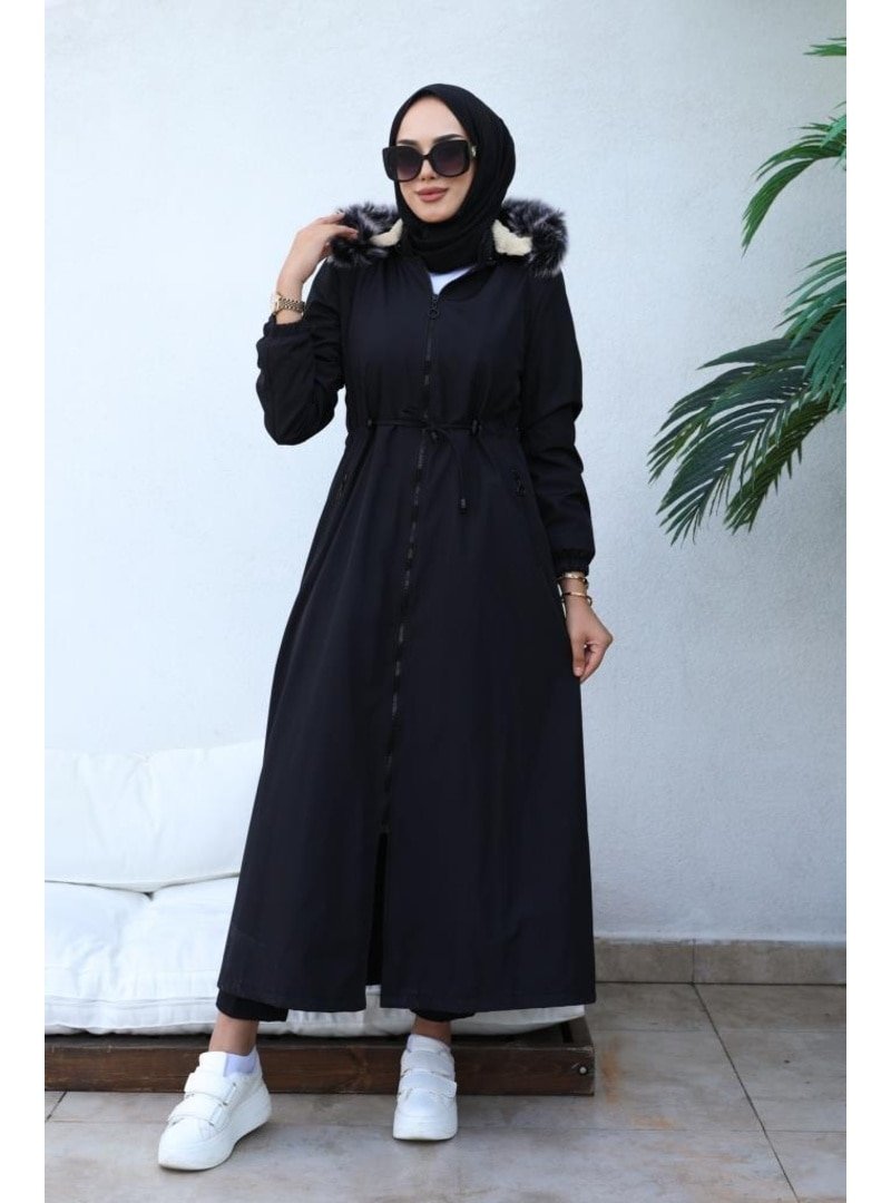 Benguen Siyah İçi Kürklü Kapüşonlu Uzun Bondit Kaban