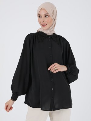 Refka Siyah Yakası Dantelli İpek Tuşeli Gömlek