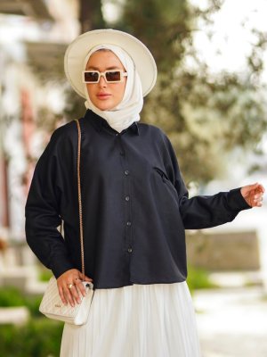 Por La Cara Siyah Önden Düğmeli Yarasa Kol Gömlek Tunik