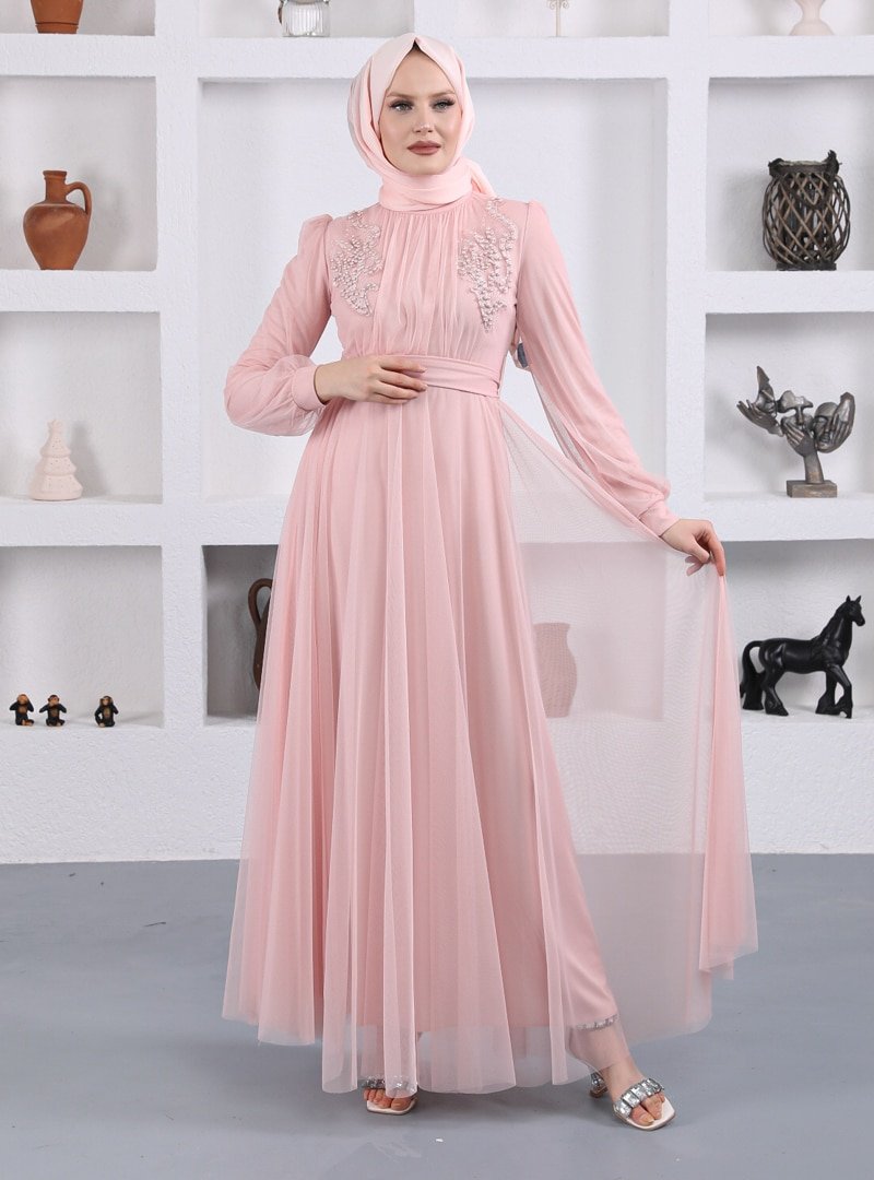 Sew&Design Pudra Omzu Aplikeli İncili Abiye Elbise