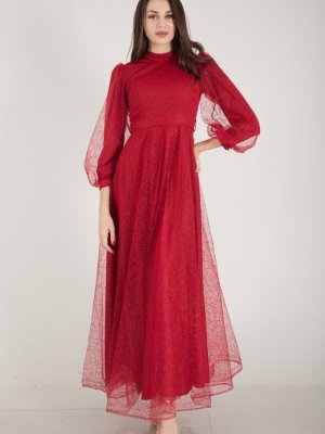 Ardanewline Kırmızı Hakim Yaka Simli Kumaş Abiye Elbise