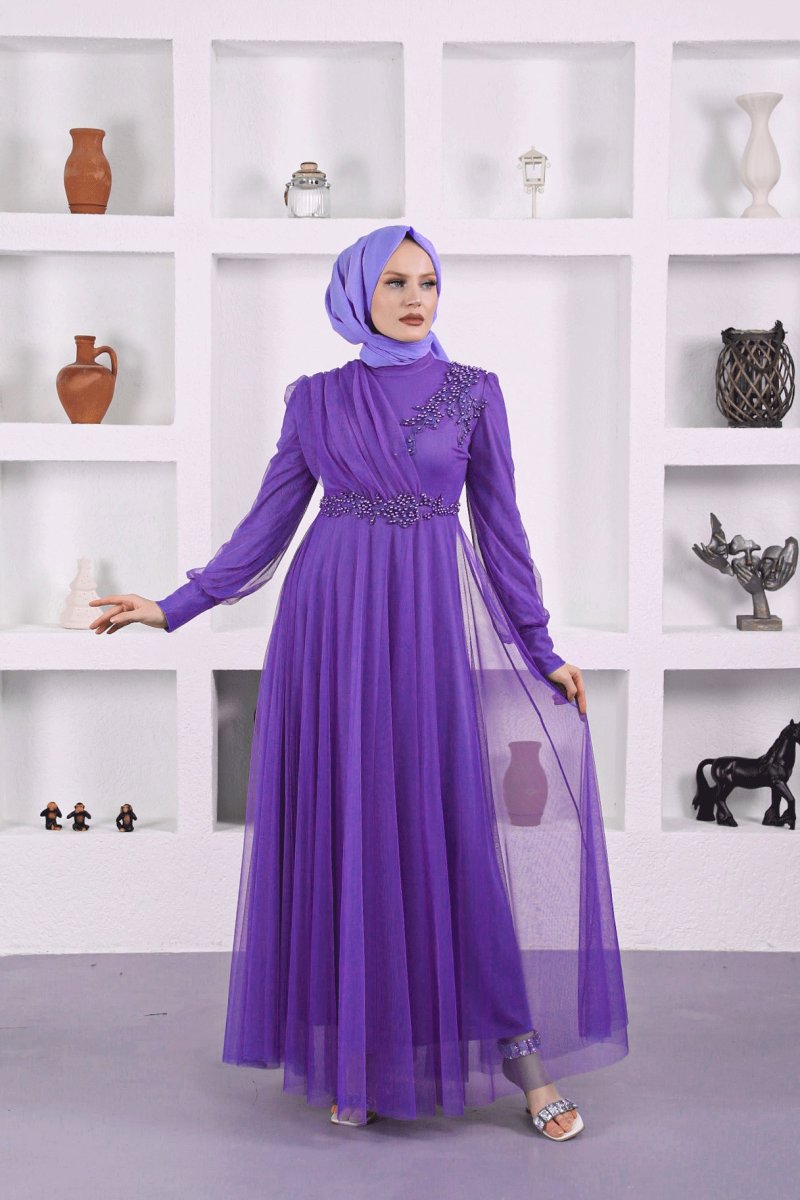 Sew&Design Leylak Aplikeli İnci İşlemeli Abiye Elbise