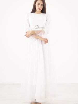 Ardanewline Ekru Kemeri Taşlı Simli Kumaş Abiye Elbise