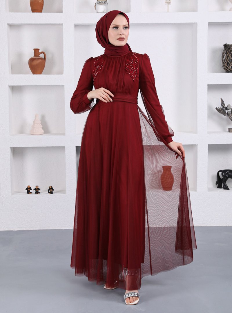 Sew&Design Bordo Omzu Aplikeli İncili Abiye Elbise
