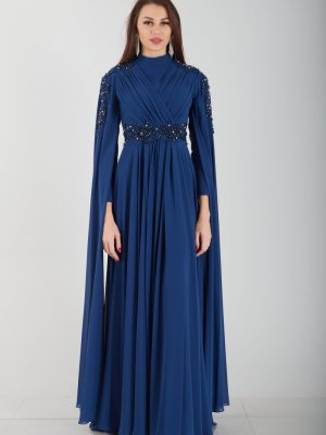 Ardanewline Lacivert Uzun Kol Omuz Ve Bel İşlemeli Abiye Elbise