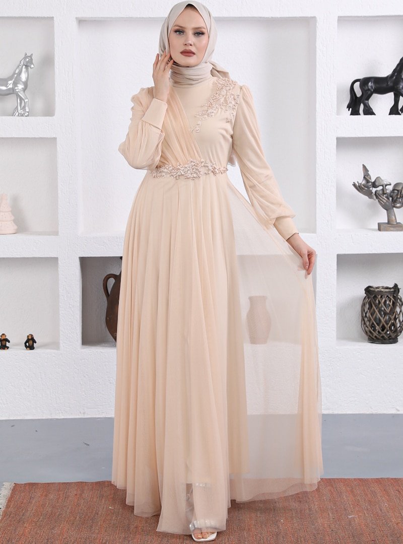 Sew&Design Aplikeli İnci İşlemeli Abiye Elbise Ten