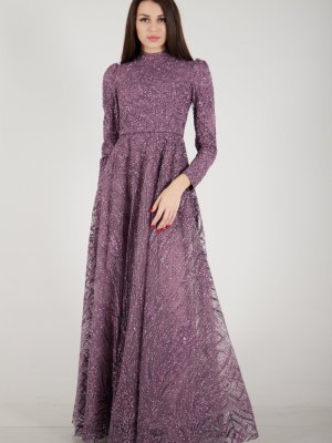 Ardanewline Lavanta Uzun Kol Simli Abiye Elbise