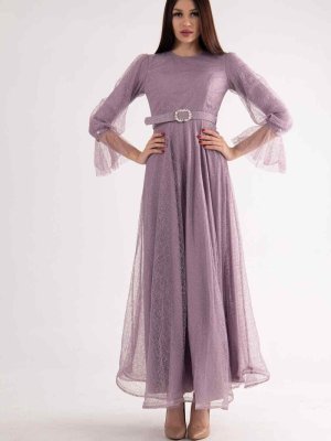Ardanewline Lavanta Kemeri Taşlı Simli Kumaş Abiye Elbise