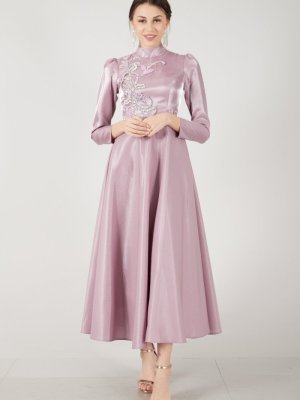 Ardanewline Lavanta Uzun Kol Üzeri Taş İşlemeli Abiye Elbise
