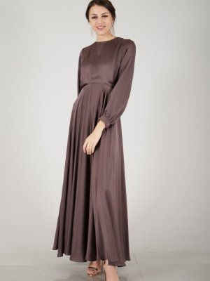 Ardanewline Açık Kahve Kloş Astarsız Saten Abiye Elbise
