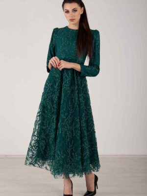 Ardanewline Zümrüt Uzun Kol Simli Abiye Elbise