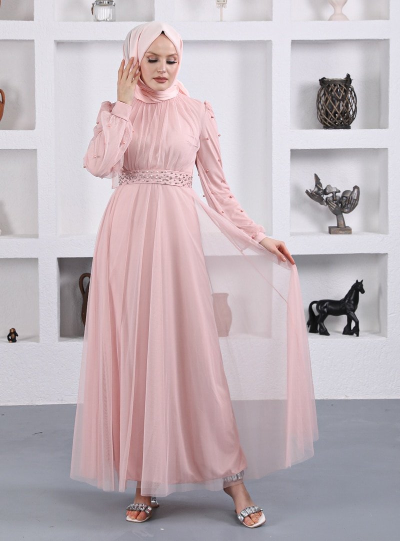 Sew&Design Pudra İncili Kemerli Abiye Elbise