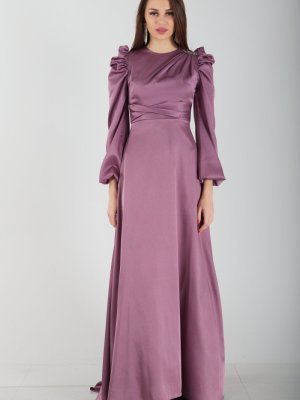 Ardanewline Lavanta Uzun Karpuz Kol İşleme Detaylı Saten Abiye Elbise