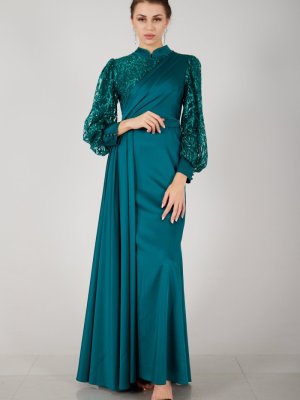 Ardanewline Zümrüt Önü Ve Kolları Sim Detaylı Saten Abiye Elbise