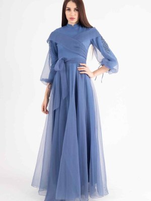 Ardanewline İndigo Kolları İşlemeli Dalya Abiye Elbise