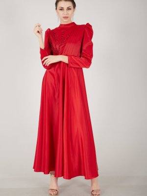 Ardanewline Kırmızı Önü Taş İşleme Detaylı Saten Abiye Elbise