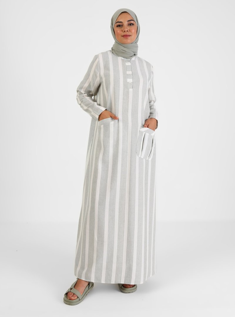 Tavin Naturel Kumaş Cep Detaylı Çizgili Elbise Haki