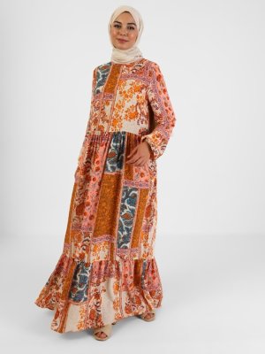 Tavin Turuncu Rahat Kesim Katlı Desenli Elbise