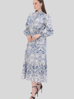 butikburuc İndigo Düğmeli Etnik Desen Boydan Elbise