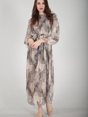 Ardanewline Bej Üzeri Desenli Piliseli Elbise