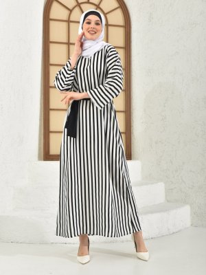 Tuncay Geniş Garni Kemer Detaylı Çizgili Desen Elbise Ekru Siyah