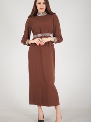 Ardanewline Kahve Boncuk Detaylı Elbise