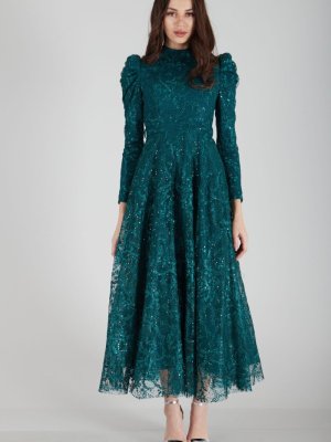 Ardanewline Zümrüt Üzeri Dantelli Pul İşlemeli Abiye Elbise