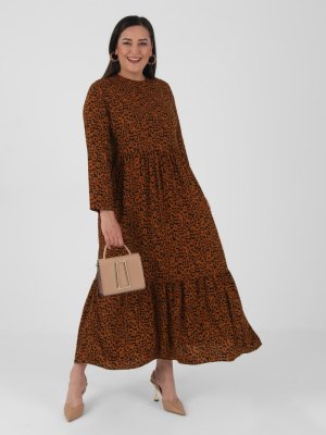 Alia Camel Siyah Büyük Beden Doğal Kumaşlı Leopar Desenli Elbise
