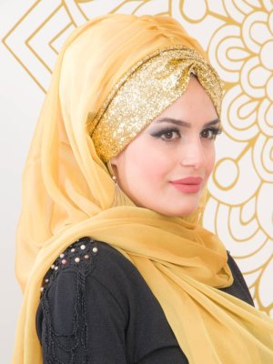 AİŞE TESETTÜR Gold Simli Fransız Şifon Hazır Abiye Şal