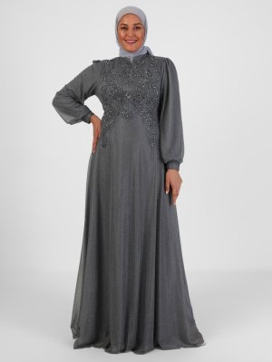 Atay Gökmen Gri Simli Taş İşleme Büyük Beden Abiye Elbise