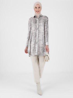 Refka Vizon Kahve Yılan Desenli Geniş Kesim Saten Tunik